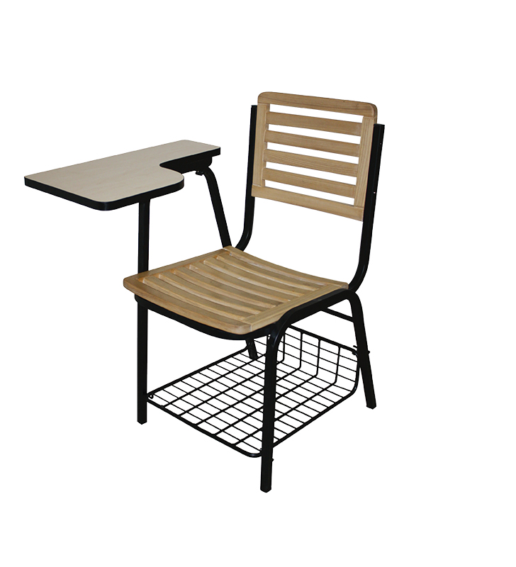 Trainee chair with fixed type writing pad and oddment shelf made of mild steel structure and with well-seasoned mehagoni wood with polish.